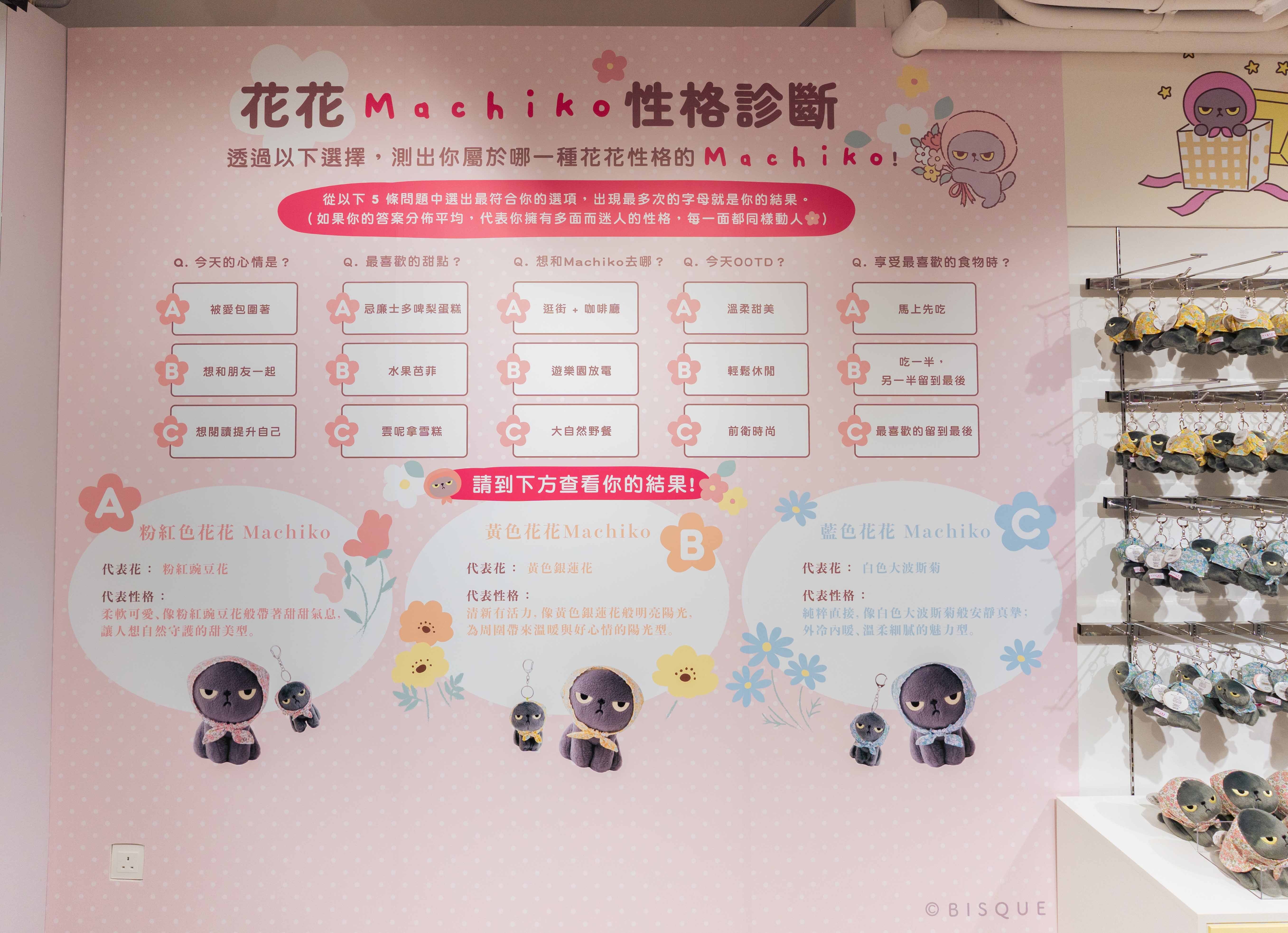 打卡之後來挑戰人氣「Machiko 性格診斷牆」吧!只需回答幾條有趣問題,就能測出你是屬於哪一種花花性格的Machiko︰是粉紅色、黃色還是藍色?得知結果後可選購代表你的 Machiko 公仔,為生活加添色彩。
