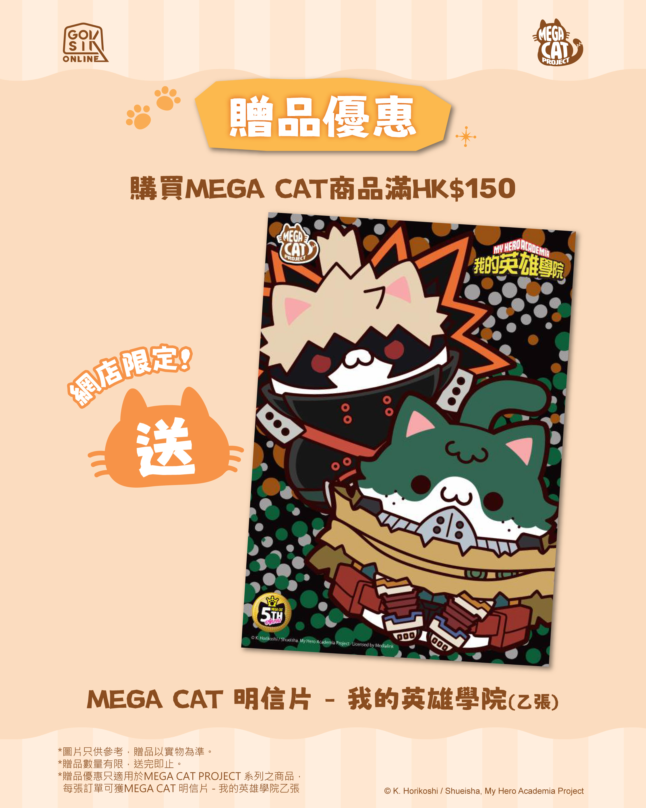 1. 【網店限定】於GOK SIK ONLINE STORE購買MEGA CAT PROJECT 商品滿HK$150即送MEGA CAT 明信片 - 我的英雄學院(乙張)