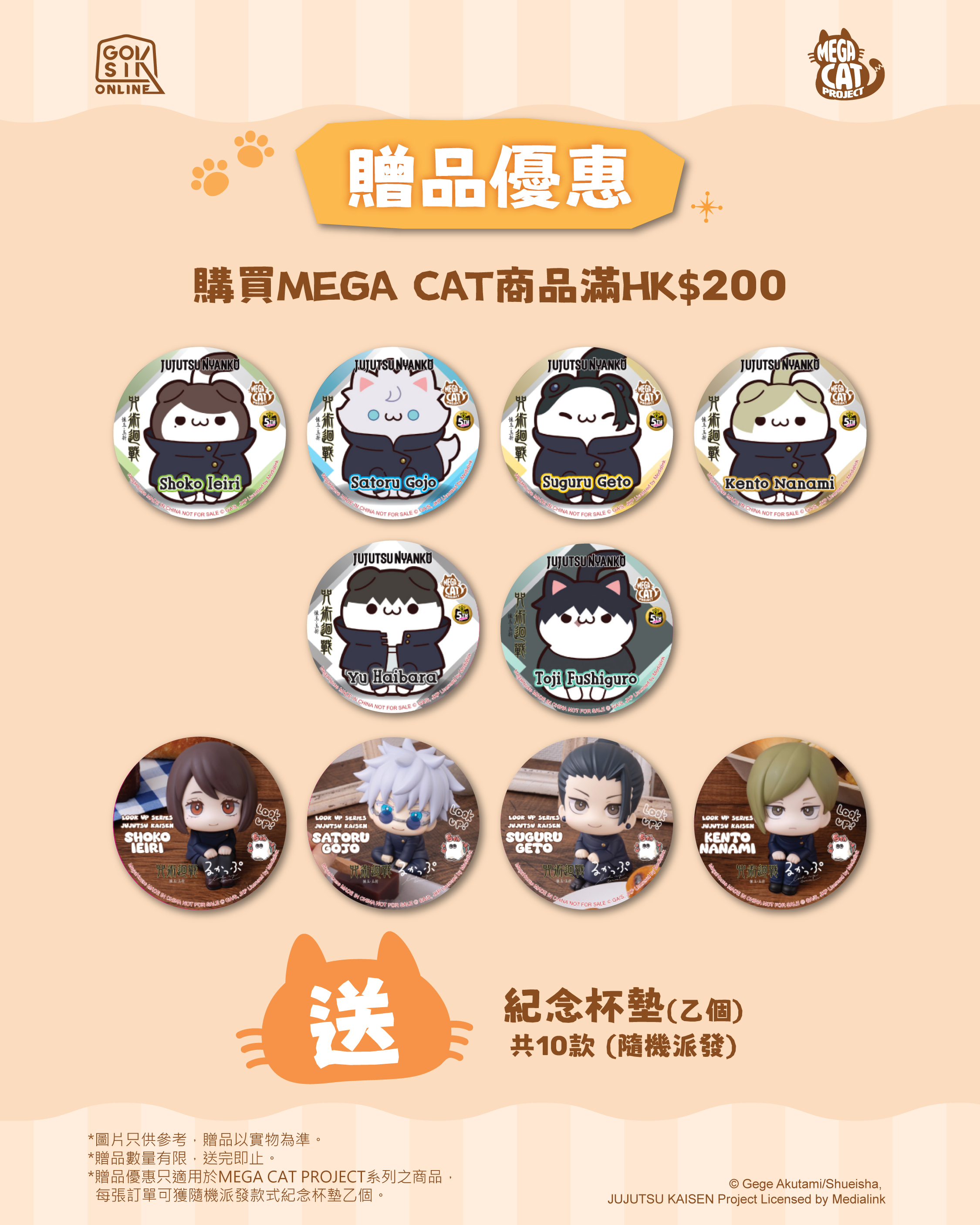 2. 【限定店及網店同步】購買MEGA CAT PROJECT/ Lookup商品滿HK$200即送【LOOKUP x MEGA CAT紀念杯墊】(乙個),共10款,隨機派發。