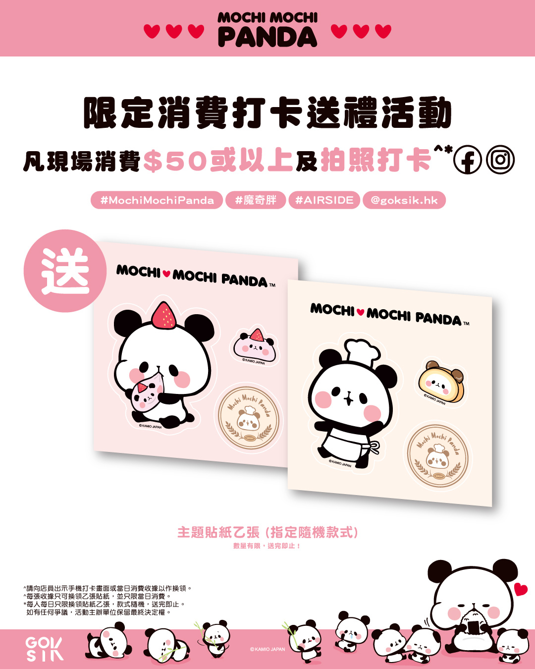 凡現場消費$50或以上及拍照打卡並標註 #MochiMochiPanda #魔奇胖 #AIRSIDE @goksik.hk,即可獲得Mochi Mochi Panda主題貼紙乙張(指定隨機款式)^*,數量有限,送完即止!