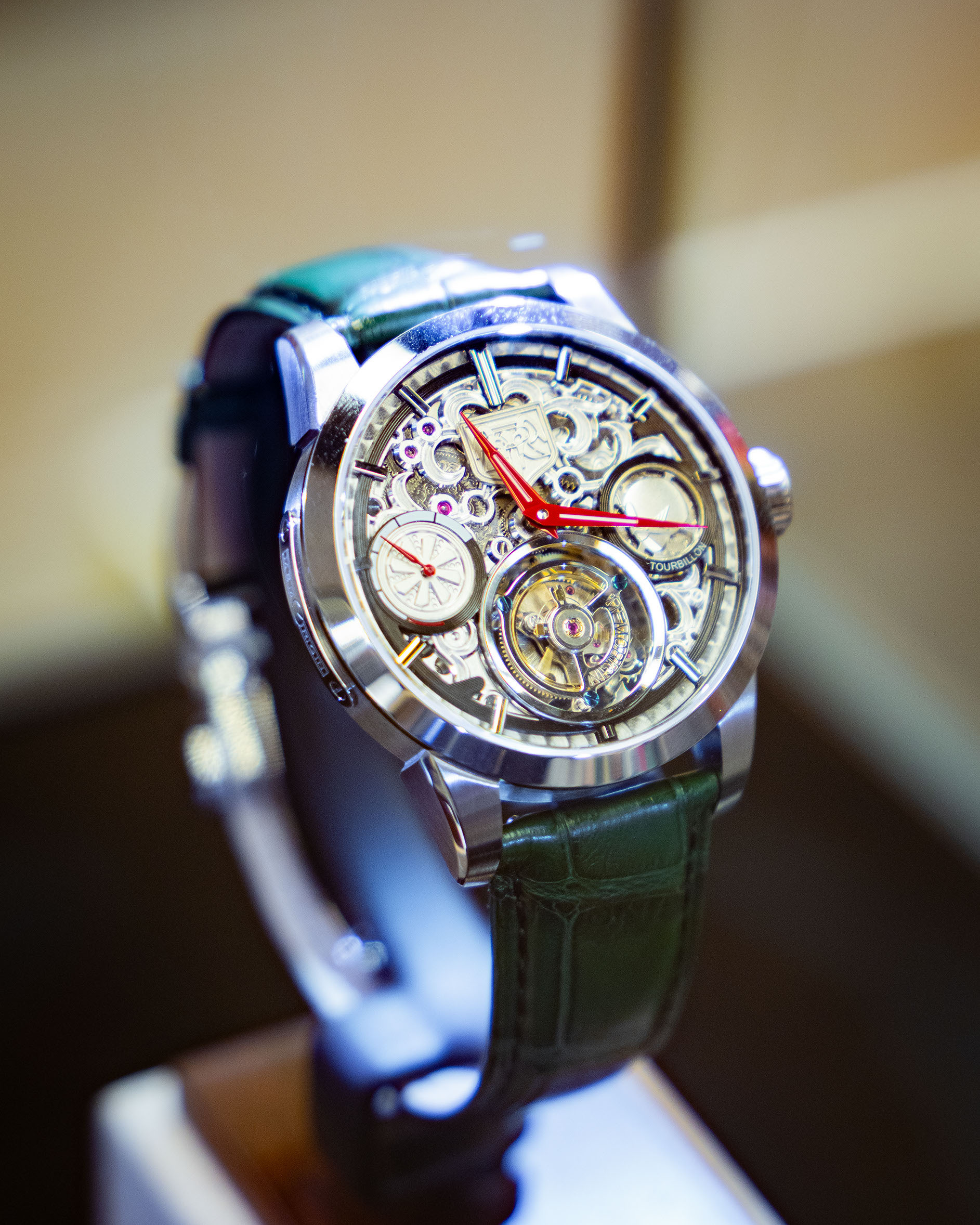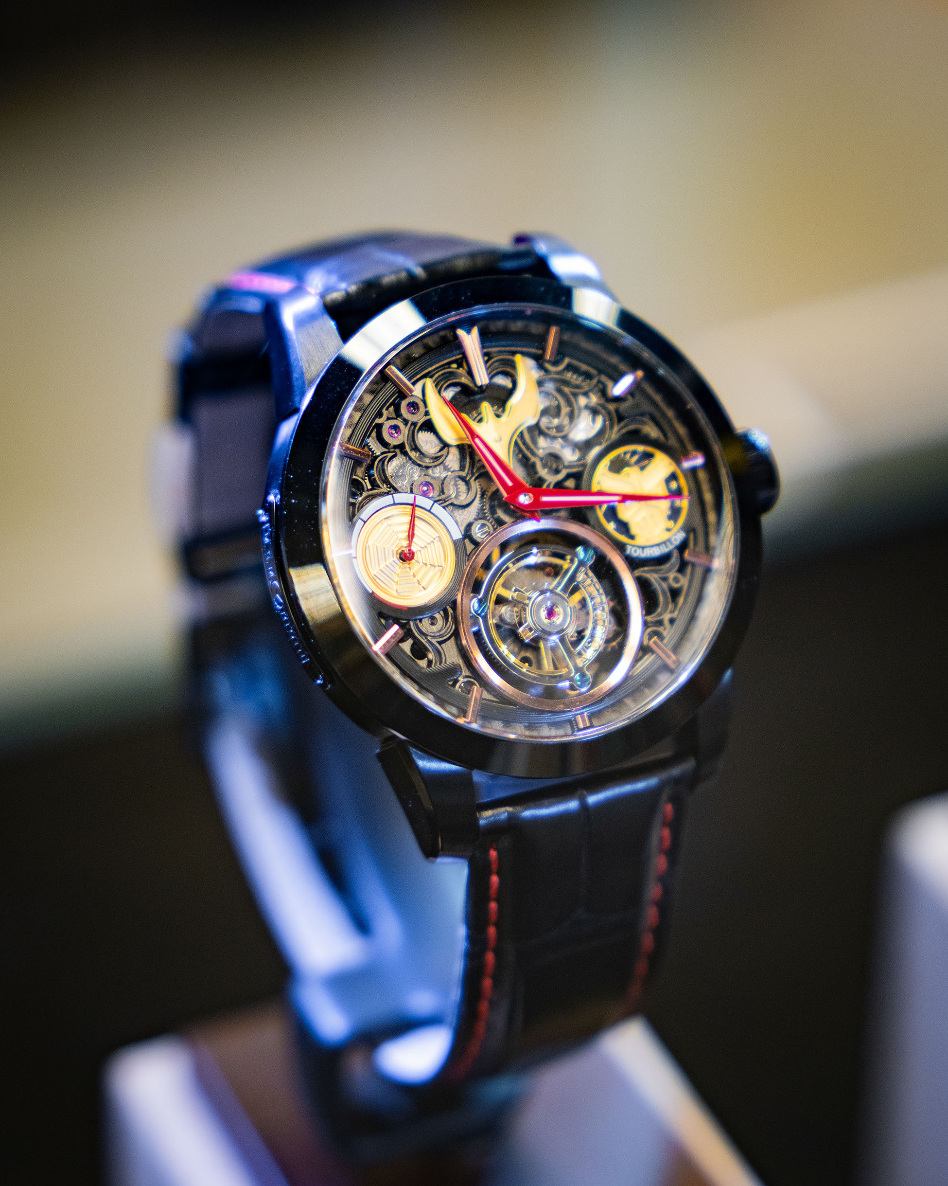 DGSQUARED聯合致力於將高級製錶工藝與文化元素融合的本地陀飛輪品牌—萬希泉推出兩款以 《幪面超人》系列為主題的限量聯乘陀飛輪腕錶,各僅發行10套。第一款致敬初代「1號」,錶盤隱 藏其面具輪廓與腰帶風車元素,配經典真皮錶帶;第二款以「古迦」全能形態為靈感,飾金色圖騰與 腰帶浮雕,搭配紅黑配色錶帶。兩款皆融合陀飛輪精湛工藝,透視機械細節,並融入日夜顯示與手動 上鏈機制,將英雄的變身精神與守護力量凝結於腕間,既是精準時計,更是熱血收藏。