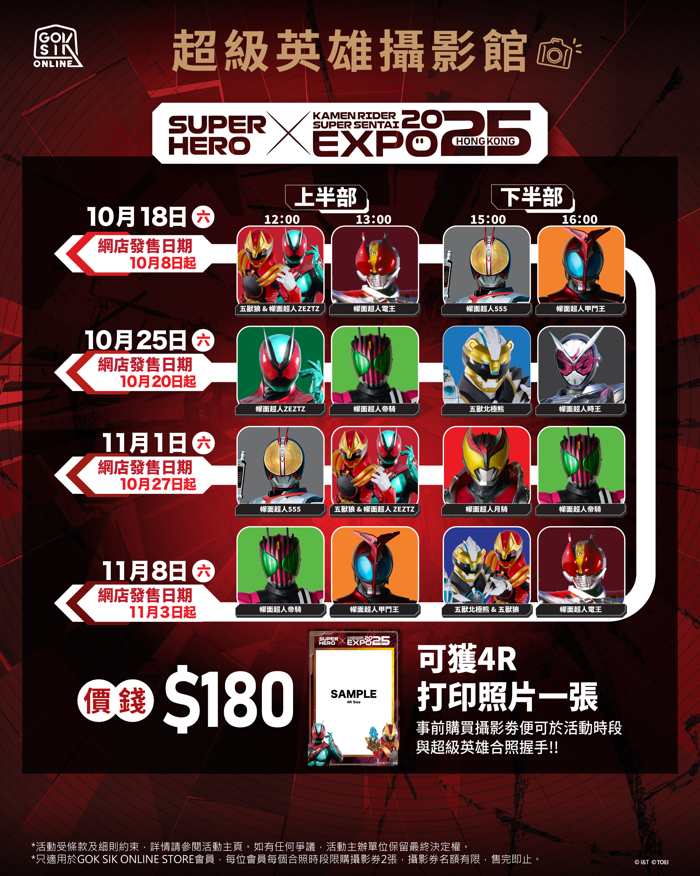 周六限定收費拍照活動,每時段會有指定特攝英雄到場與粉絲合照,有些時段更會有幪面超人及超級 戰隊成員同場合影,合照結束後會附上是次活動限定的相框,讓你一起帶回家留念,有興趣參與的粉 絲可到GOK SIK ONLINE STORE提早購買攝影劵確保名額。