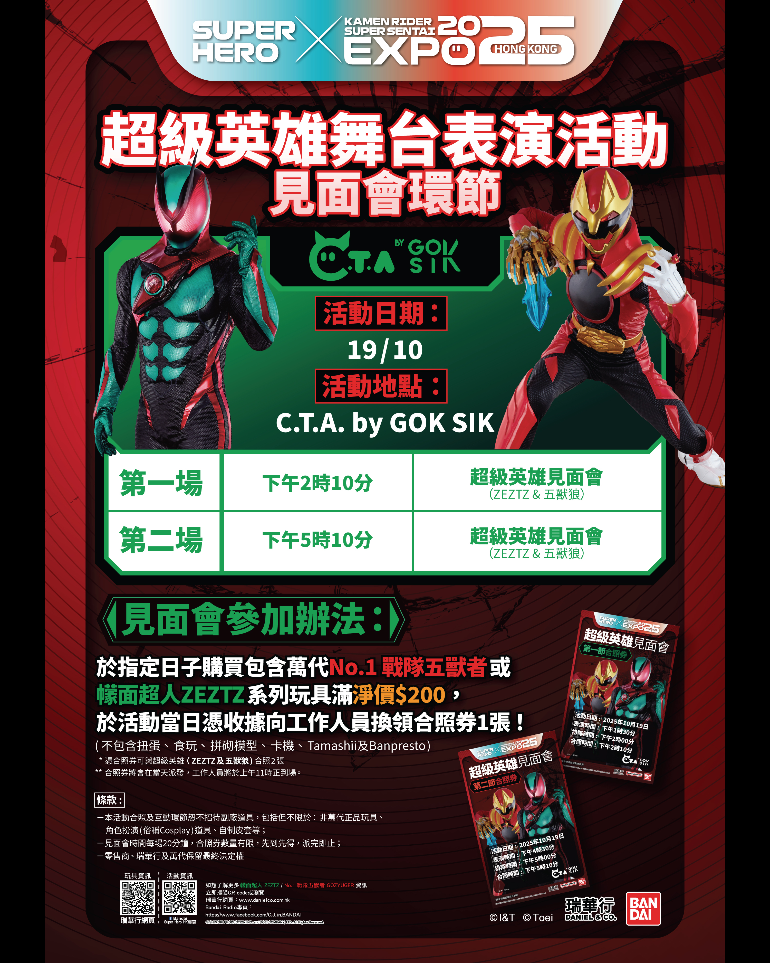 4. 於超級英雄舞台表演日買滿 HKD200 (當中必需包括有「幪面超人 ZEZTZ」或「No.1 戰隊 五獸者」的產品),即可參加當日超級英雄見面會,名額先到先得,派完即止。